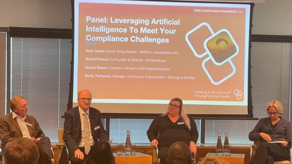 Kevin Sloane, Senior Policy Advisor, PIMFA with his panel members Marina Reason, Partner, Financial Services Regulation, Herbert Smith Freehills Kramer LLP,Becky Thompson, Manager, Continuous Improvement, Redmayne Bentley and Richard Preece, Director, DA Resilience. Speaking about Leveraging Artificial Intelligence to meet your compliance challenges at the 2025 PIMFA Compliance Conference